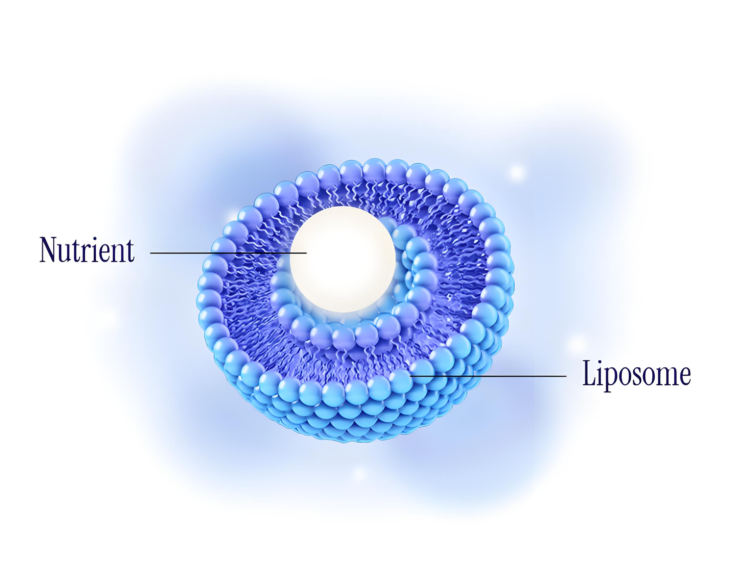 Nutrients are enclosed within liposomes—tiny, lipid-based spheres designed to protect active ingredients.